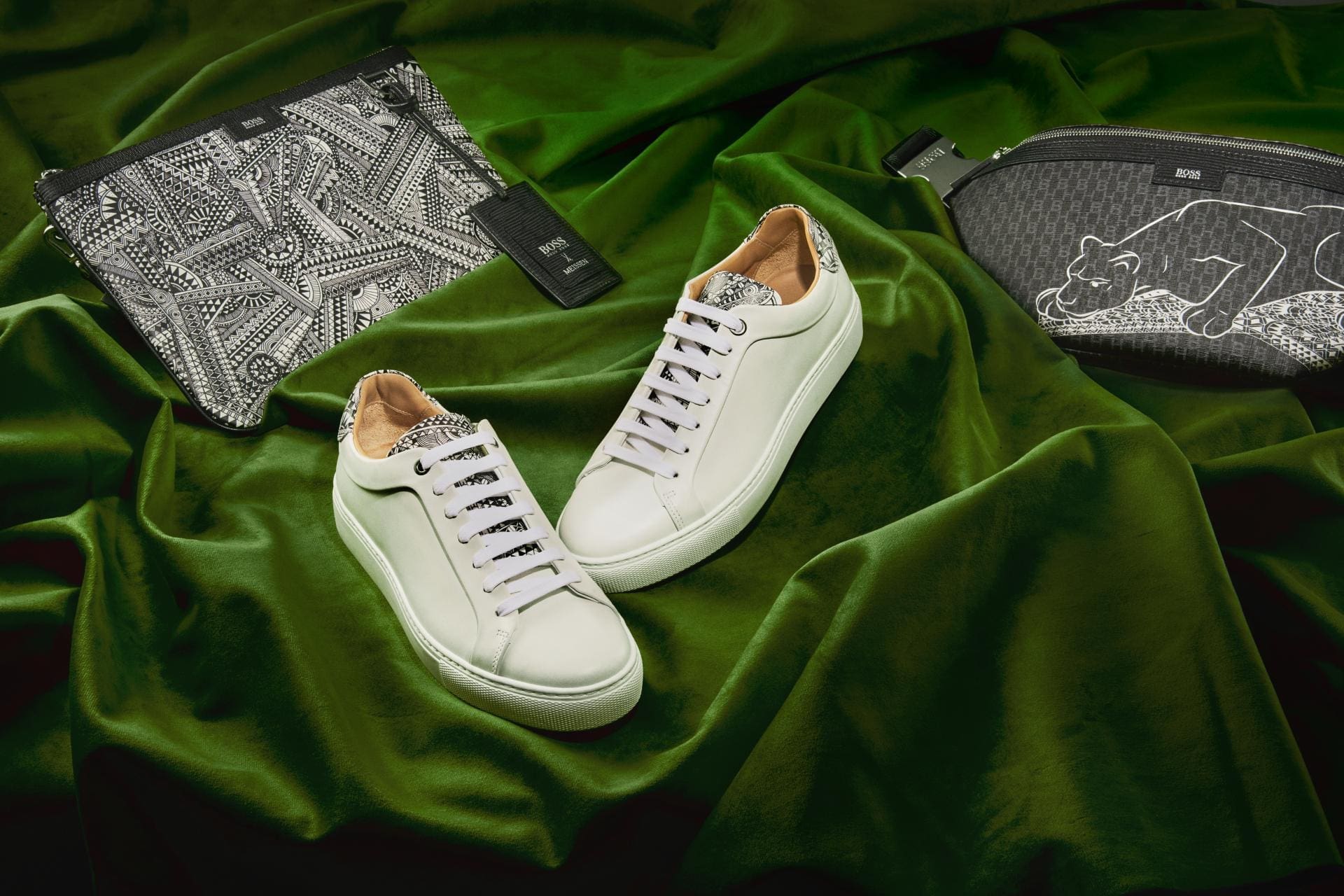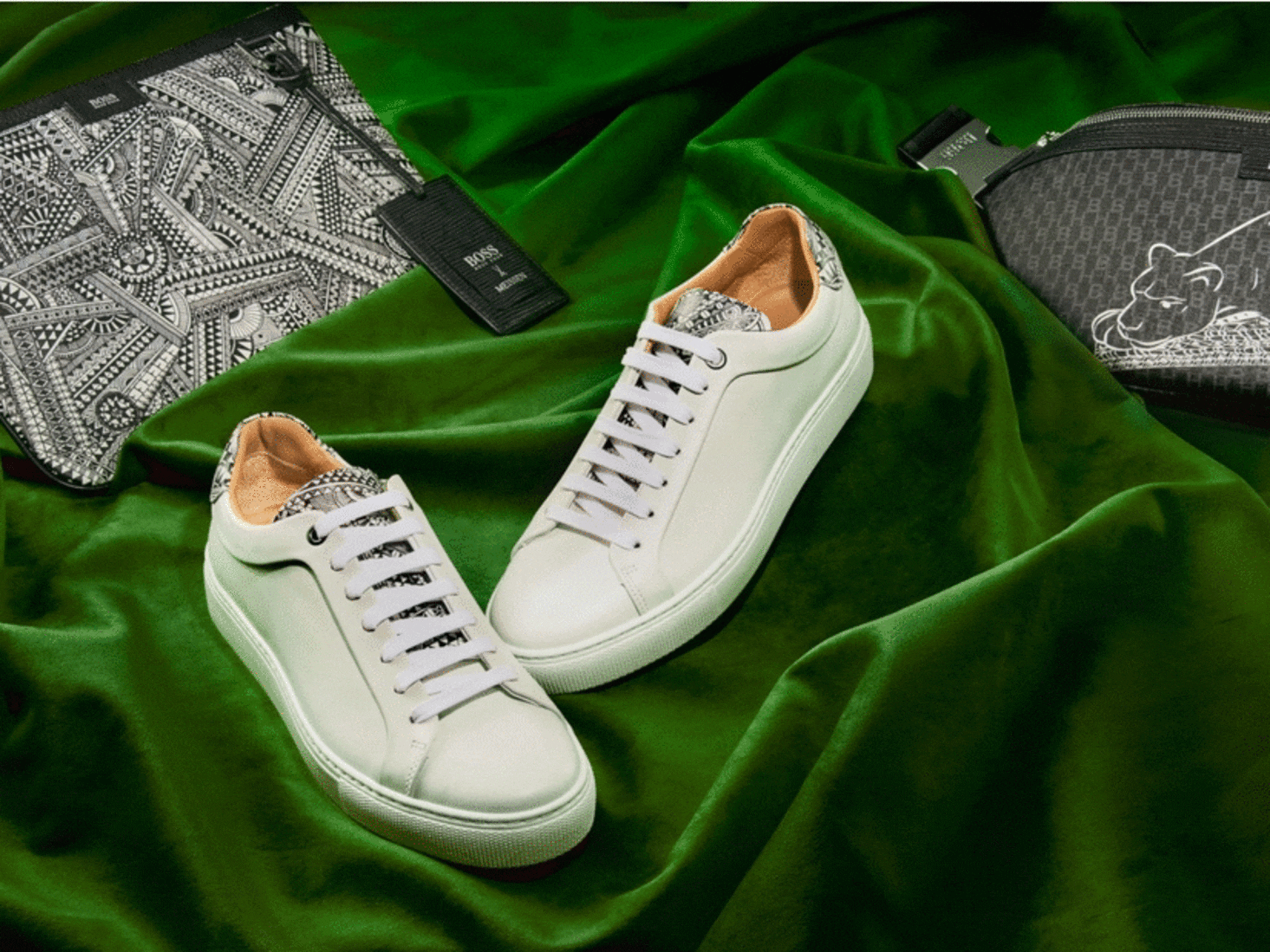 Sneaker Peek- two principals of German design collide this Christmas: BOSS and porcelain manufacturer Meissen have partnered on a capsule collection of monochrome fashion pieces inspired by the craftsman’s Big Five figurines. Each ceramic beast features a pattern inspired by the animal’s characteristics – and it’s this that provided the starting point for the BOSS collection. The result is crisp, leather sneakers with an Aztec-print tongue, zip pouches with zany monochrome motifs and a cross-body bag decorated with a lightning white leopard.
