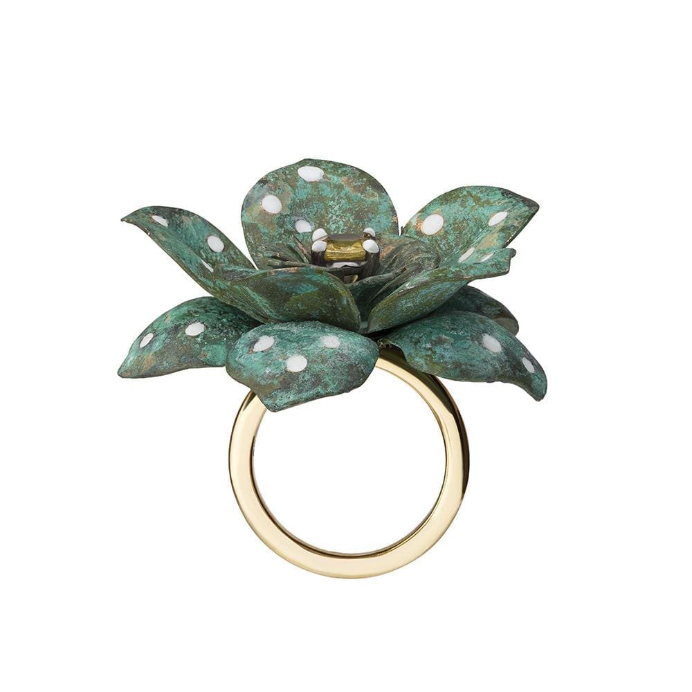For the Titania in your life, Tessa Packard’s Midsummer Ring draws on Shakespeare’s enchanting woodlands. This fanciful flower-toadstool hybrid is made from a beguiling, tactile mix of verdigris brass, enamel and black rhodium, with a glittering yellow sapphire centre stone.