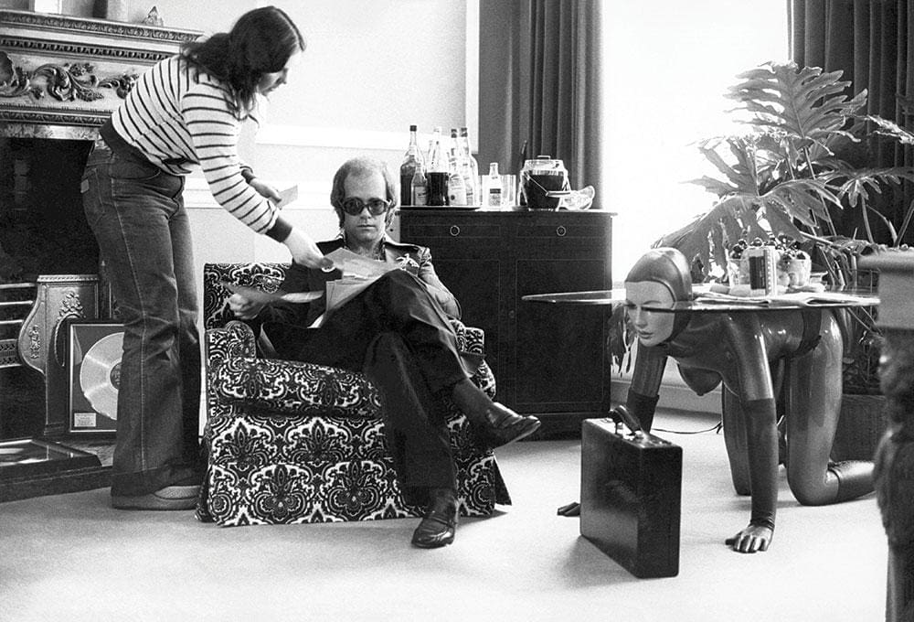 Flicking through the book, the photographer laughs as he remembers shooting one particular image of Elton John, perched in an armchair next to one of Allen Jones’s surrealist erotic tables. “Elton hated being photographed, believe it or not. I know it doesn’t seem possible when you think about all of those outlandish costumes he wore, but he did. I would go there with a list and we’d just work our way through it. I photographed him when he was nothing, so when I was with him at the peak of his career it was very easy.”