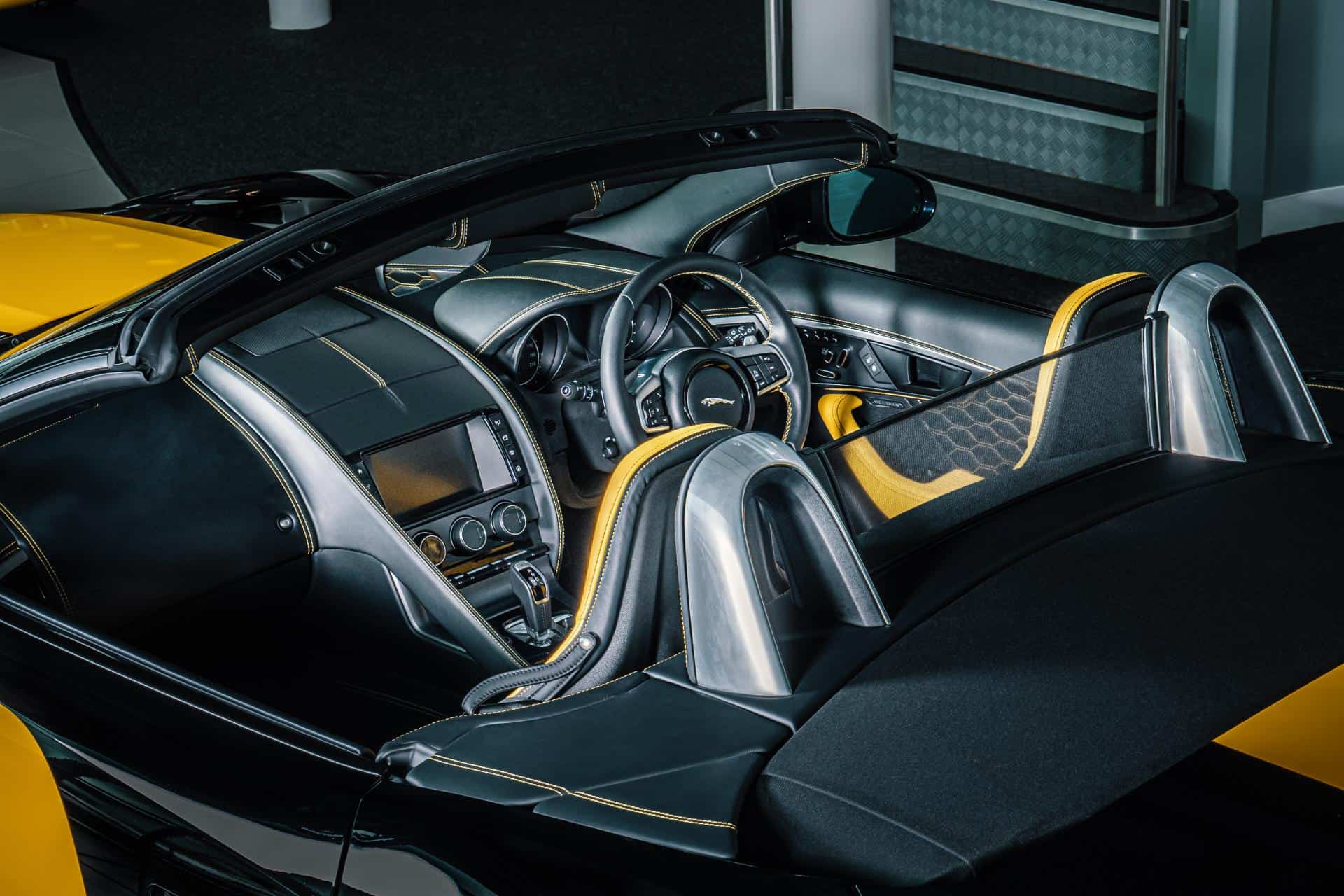 Happily, things are just as mad on the inside. Making the most of the F-type’s well laid out interior, Lister commissioned Scottish interior trimmers Bridge of Weir to overhaul the LFT-C’s cabin. With 36 colours to choose from, Bridge of Weir’s nappa leather covers everything from the doors to the roof lining and steering wheel. Finished in a striking combination of black and yellow, this particular car pays homage to the original Lister colour scheme used for its first motor in 1954. Leather aside, the Lister’s interior is identical to the F-type’s, sporting the same Jaguar-made infotainment screen and dials. Even the jumping Jaguar logo remains firmly planted in the centre of the steering wheel.