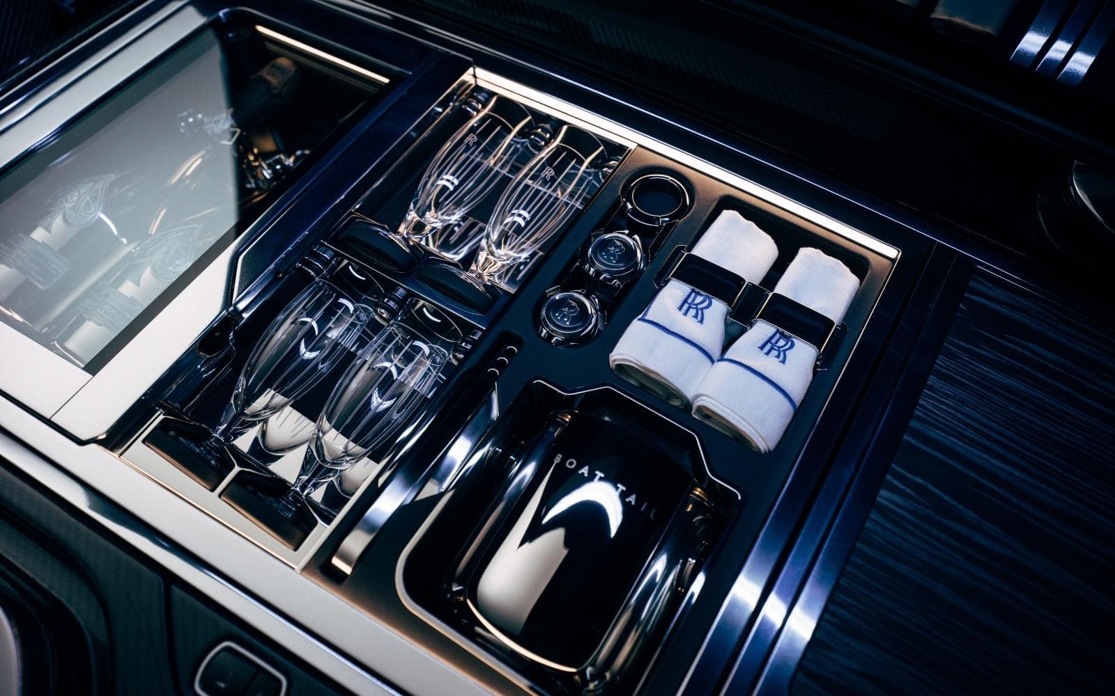 Much of what makes this first Boat Tail so special, however, is hidden from prying eyes. At the rear, twin side-opening compartments are hinged in the middle and open like a butterfly, revealing an Aladdin’s cave of treasures. On one side is a pair of twin champagne coolers, designed to fit the owner’s favourite Armand de Brignac vintages.