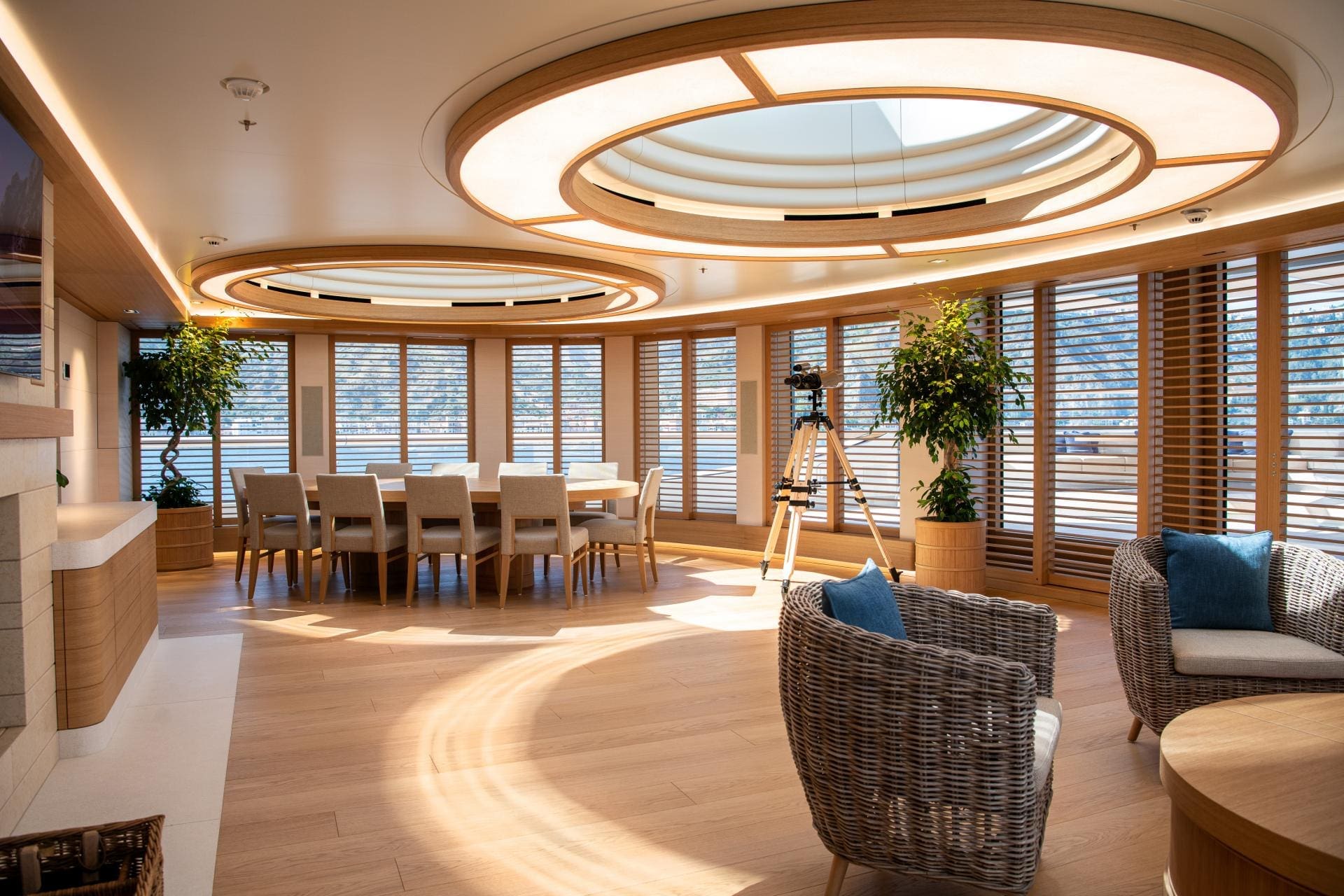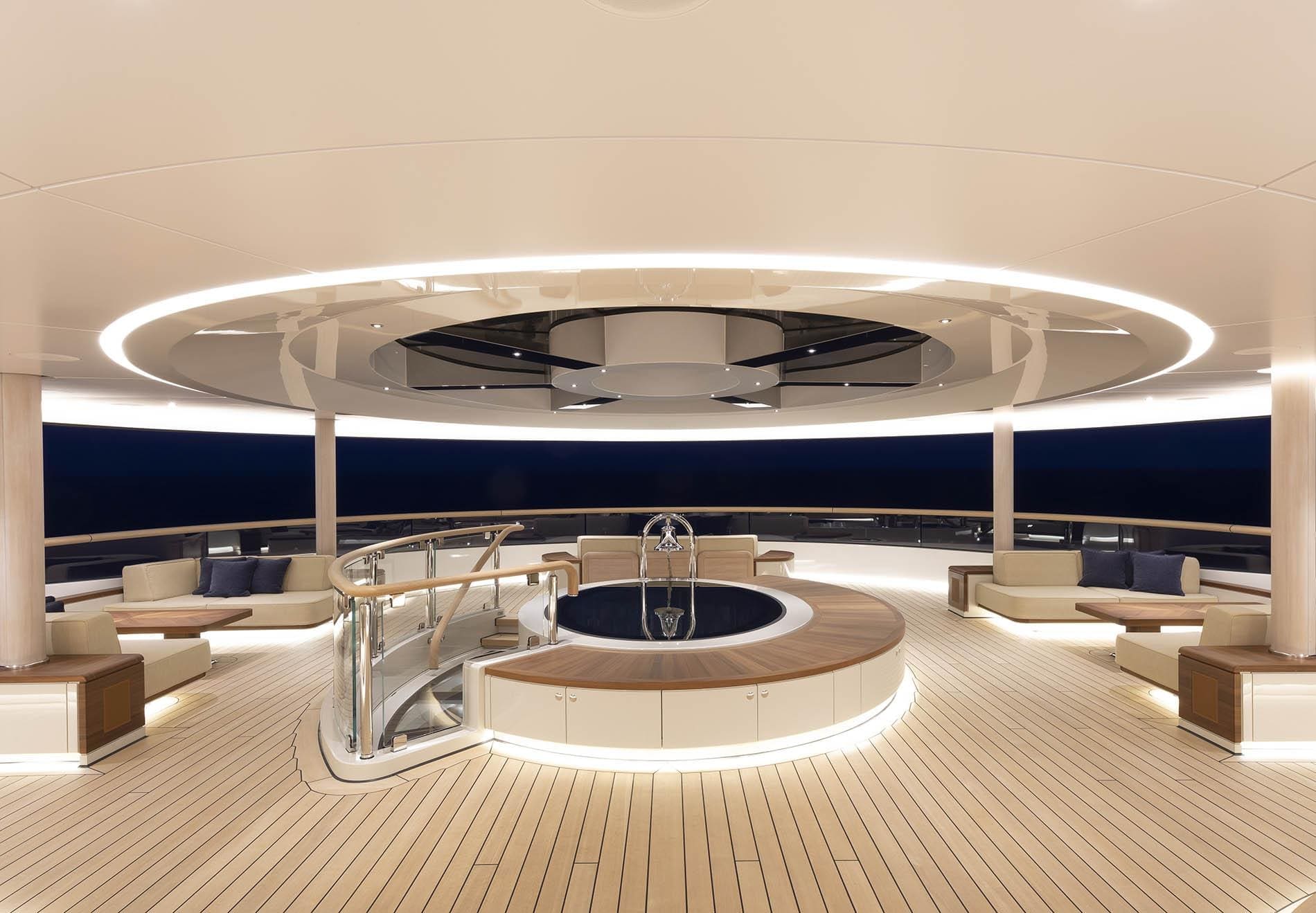 Eleven cabins – one master and 10 VIP – all have sea terraces and en-suite bathrooms, while crew accommodation has space for 54 staff. The cherry on the cake is a pair of helipads, one on the sundeck and one on the bridge deck, that allow visitors to board via the largest helicopters on the market – which gives you an idea of the sort of people they expect to be dropping by.