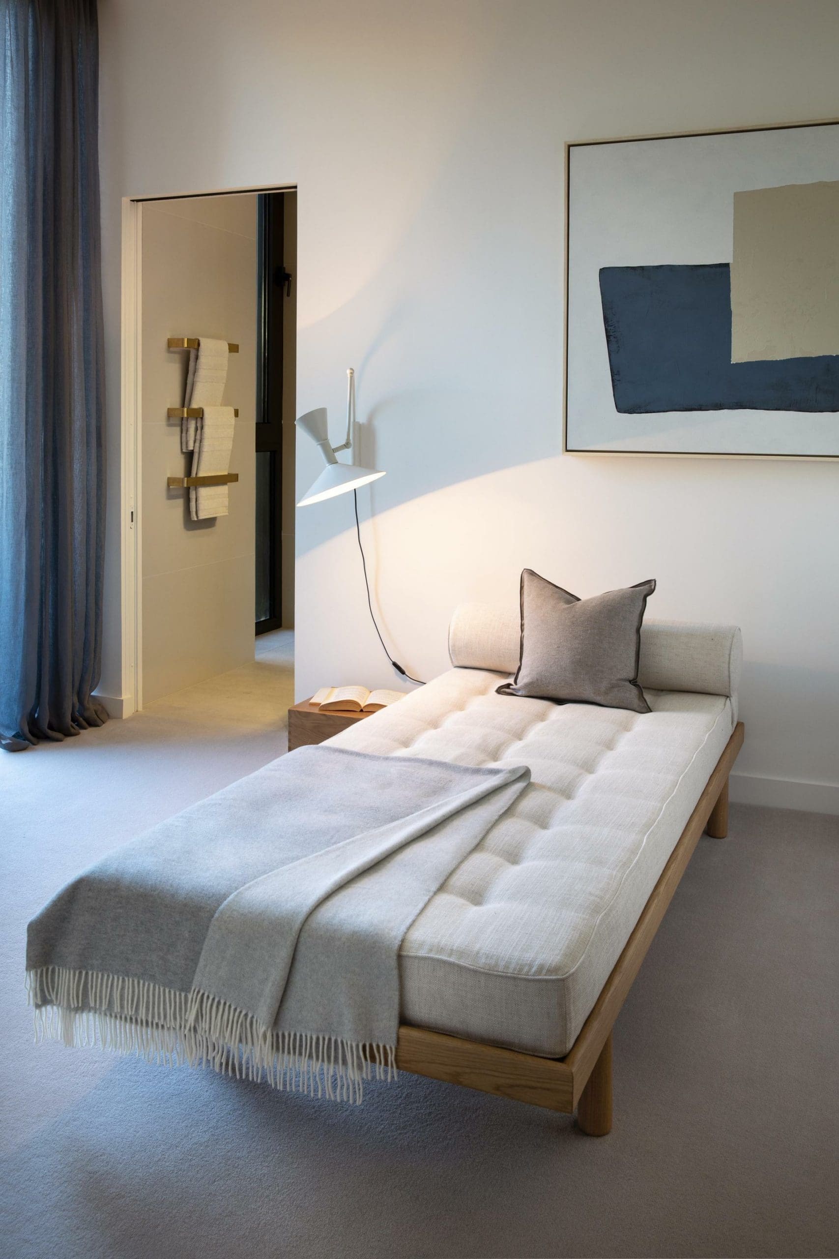Groundbreaking works pepper the apartment, with pieces by international architects and designers including the Veliero Bookcase by Franco Albini, LC4 Villa Church chaise-longue by Le Corbusier, Charlotte Perriand and Pierre Jeanneret and Philippe Stark’s Volage bed, featuring a padded capitonné headboard upholstered with the newly-launched Ortigia Acier velvet. Highlights from Cassina’s newest collections sees the Dress-Up! sofa by Italian designer Rodolfo Dordoni take centre stage in the living room. The cream woven fabric characterised by elegant details pays homage to the principles of dressmaking and offers an open invitation to relax and enjoy views over the West London skyline – if you can peel your eyes away from the apartment’s interior.