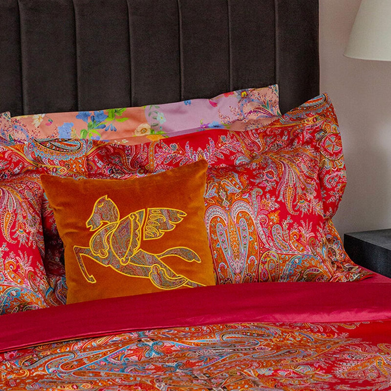 Your bedroom should be a haven of calm but that doesn’t mean you can’t fill it with joyful shades that will always have you getting out on the right side of bed. For summer, step away from classic white bedding and embrace something bolder. Allow us to point you in the direction of UK-based interiors brand Bulan, and its rich forest-green bed linen. You could simply pair the duvet cover with your favourite white sheets and pillowcases but we recommend going for the full set and finishing with Etro’s embroidered velvet cushion. Their burnt orange hue makes for the perfect pairing.