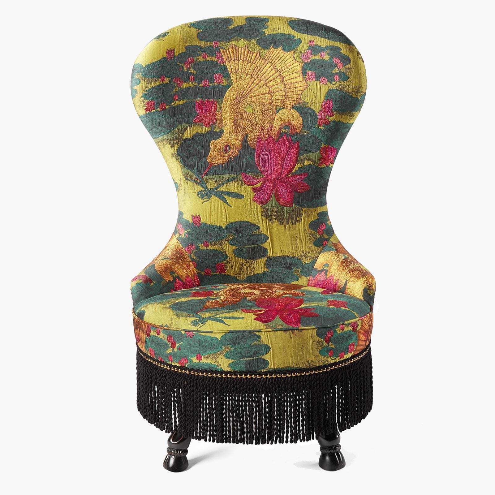 Continue the colour scheme with Oka’s tactile sea-green Aberarth table lamp. Ideally sized for a bedside table or dresser, its handmade glass base reflects light in a way that is soothing while creating romantic highlights around a room. Finally, no bedroom is complete without a statement armchair, and this season’s finest comes from Gucci’s homeware range. It may not be cheap but this Moire chair, embroidered with a jacquard dragonfish scene, is so worth it.