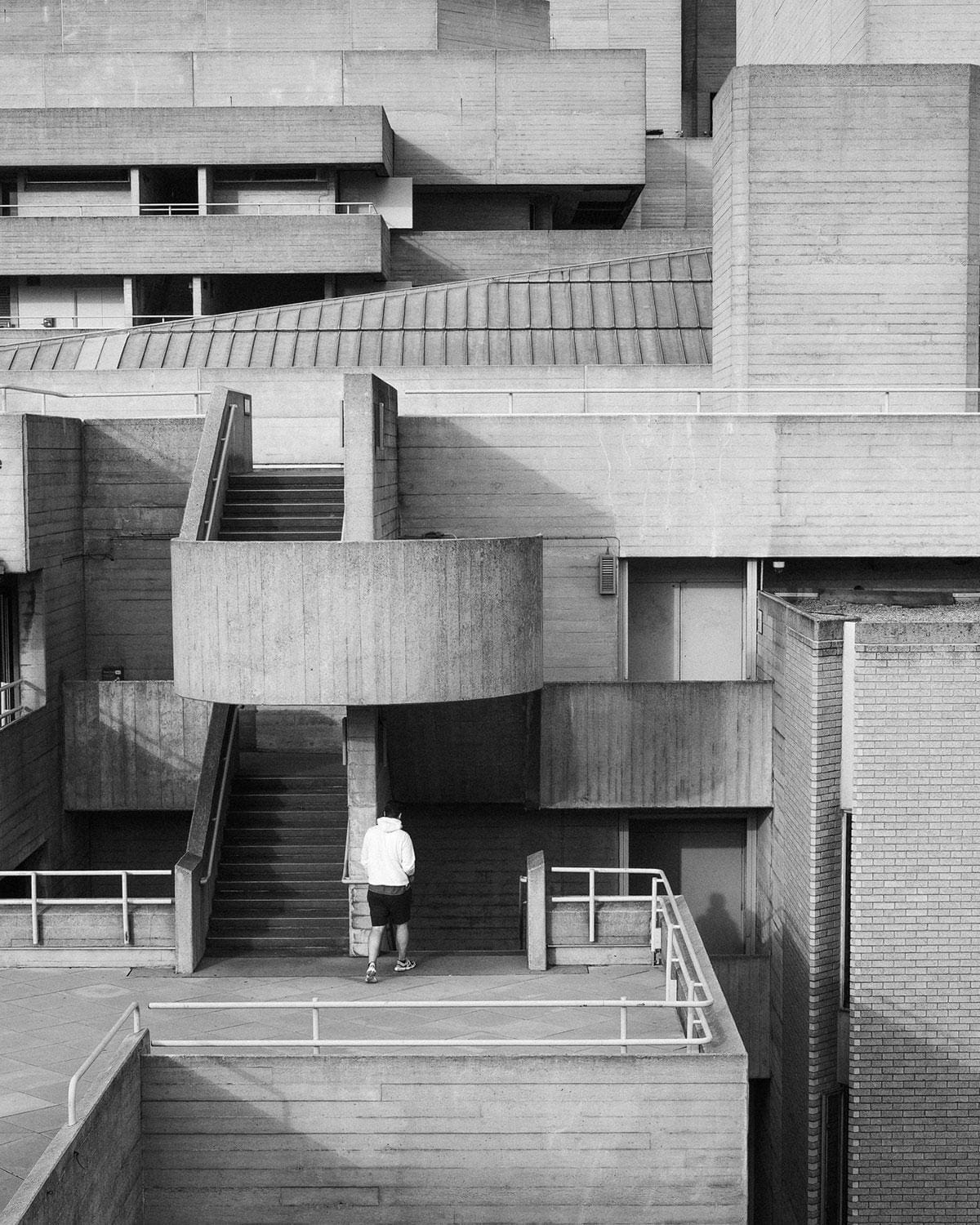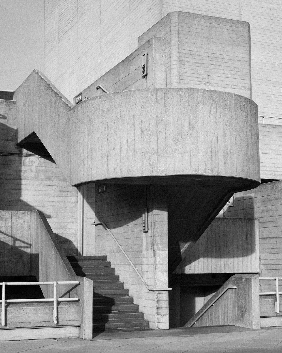 You have to walk up another set of steps and across a small walkway to get the best view of it, which is incidentally the best view of the theatre. The staircase is open to the elements and is quite small, and from this particular angle gets lost among the sharp strips of grey of the rest of the building. Its bulbous, rounded section gives it away though, and is representative of a time when the future was concrete.