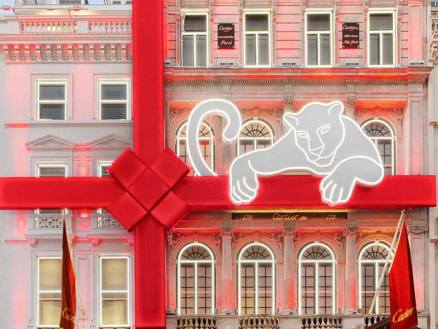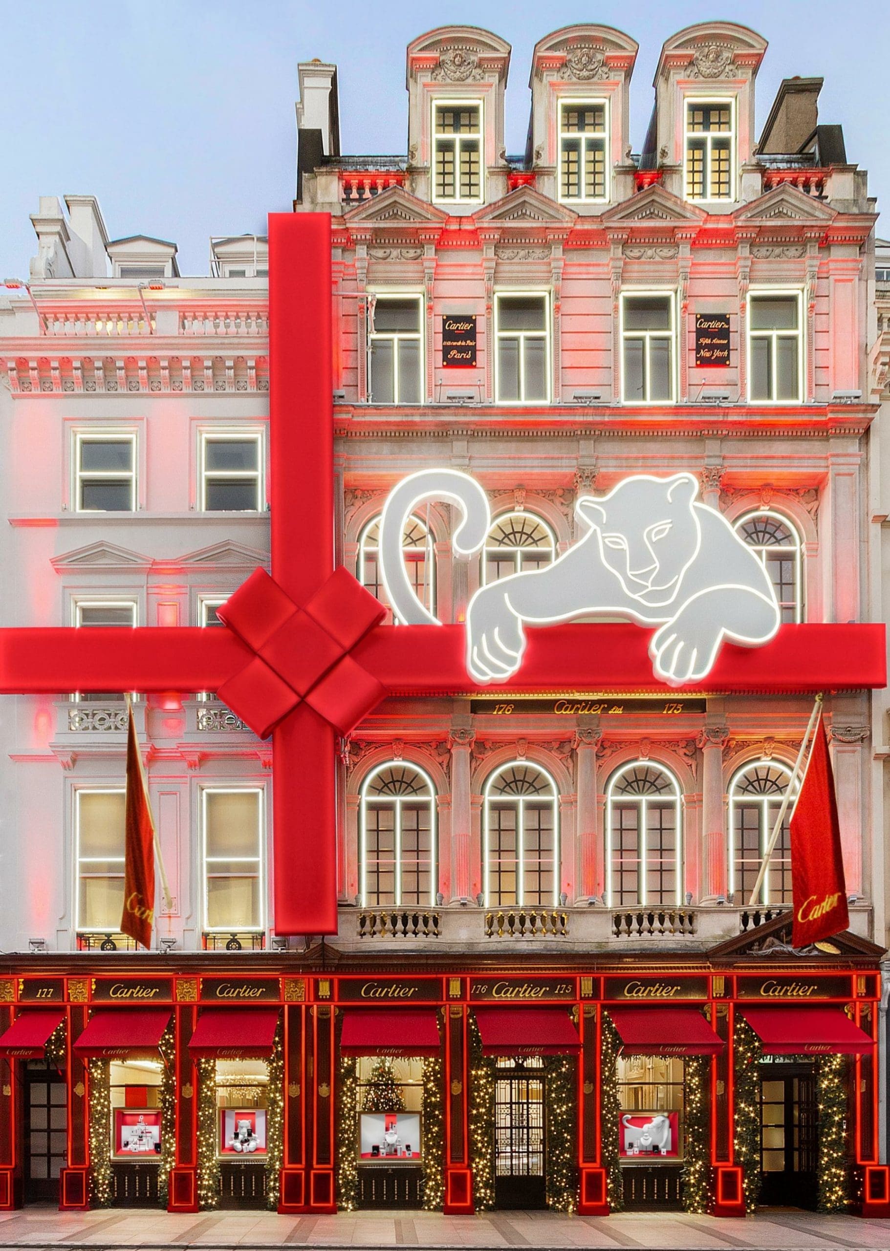 For those on the hunt for further festive light displays, a stroll down Bond Street reveals Cartier’s spectacular Christmas decorations. The London flagship is wrapped in a supersized red bow and topped with a prowling wild cat – which has been the French maison’s emblematic feline motif for more than 100 years. The panther was first adopted by Cartier in 1914, when it placed its first panther spot on a wristwatch. From 2 December, the New Bond Street boutique will display a resplendent light and music show every day at 5pm, 6pm and 7pm – certain to spread a little Christmas cheer in London this December.