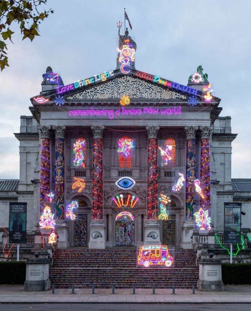 On display to enjoy from now until January, Tate Briain’s neoclassical facade has been given a neon makeover by Liverpudlian artist Chila Kumari Singh Burman. Entitled Remembering A Brave New World and launched to coincide with the Indian festival of Diwali, the uplifting display is festooned with multi-coloured lights, inspired by Bollywood iconography, mythological Indian motifs and pop culture references. Look out for the third eye, a traditional symbol of enlightenment, and the elephant-headed god Ganesha.