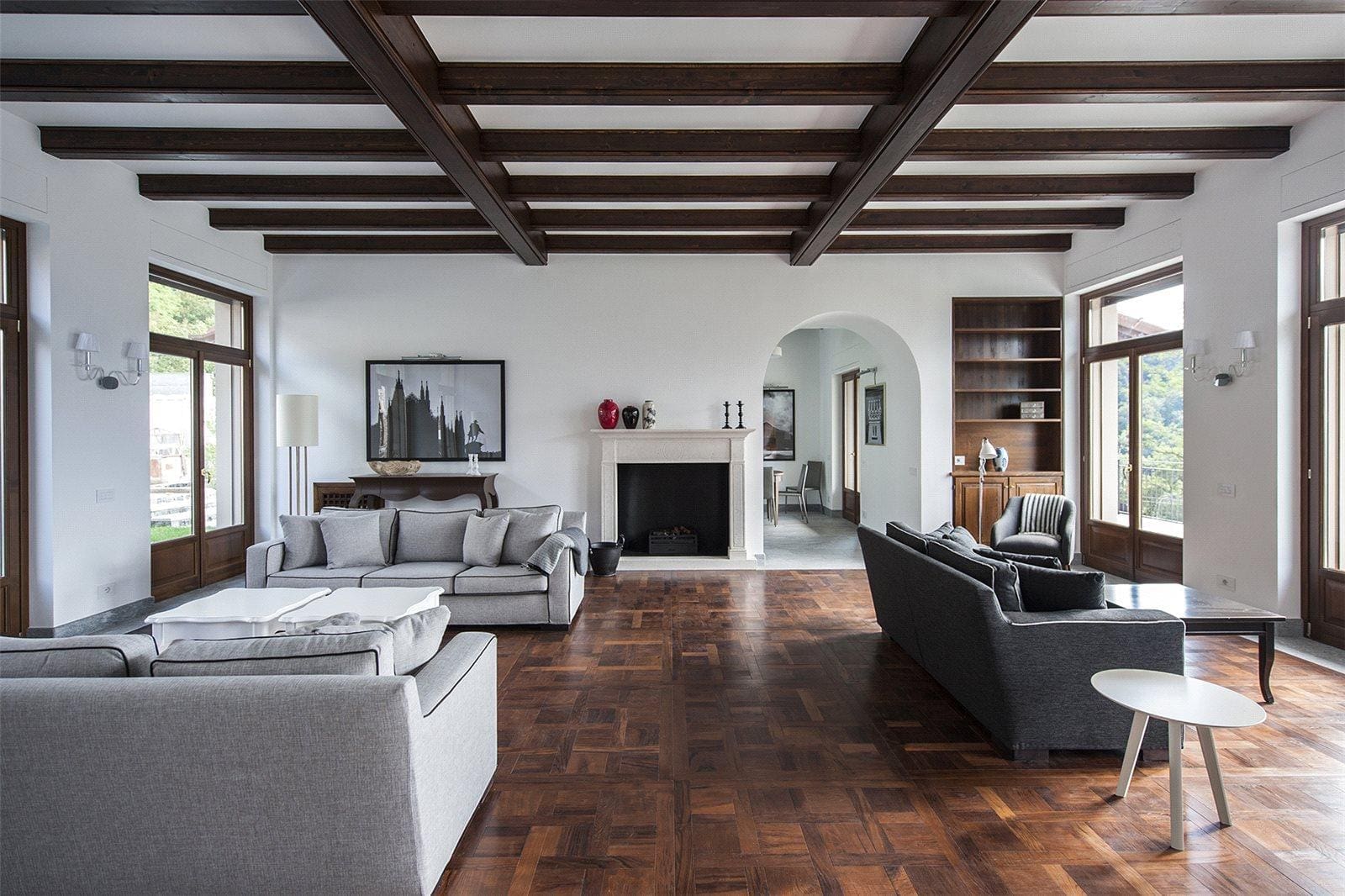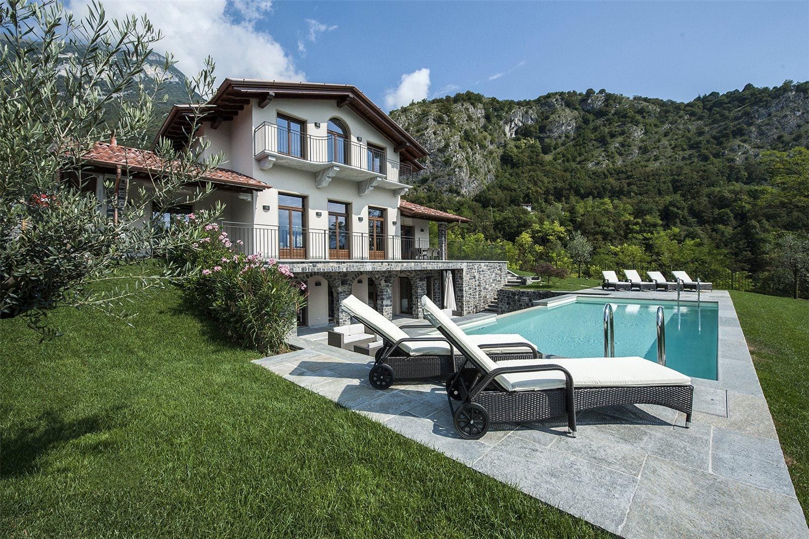 Dwell on the banks of Lake Como in modern splendour in this newly built, five-bedroom home, located near the famous Grand Hotel Tremezzo. Light pours into two large living rooms, with high ceilings, parquet flooring and an inviting marble fireplace. There are no less than seven bathrooms, an open-plan kitchen and a wine cellar, as well as space for two cars. The vast outdoor area is soaked in buttery sunlight, with panoramic views over Italy’s lush greenery.