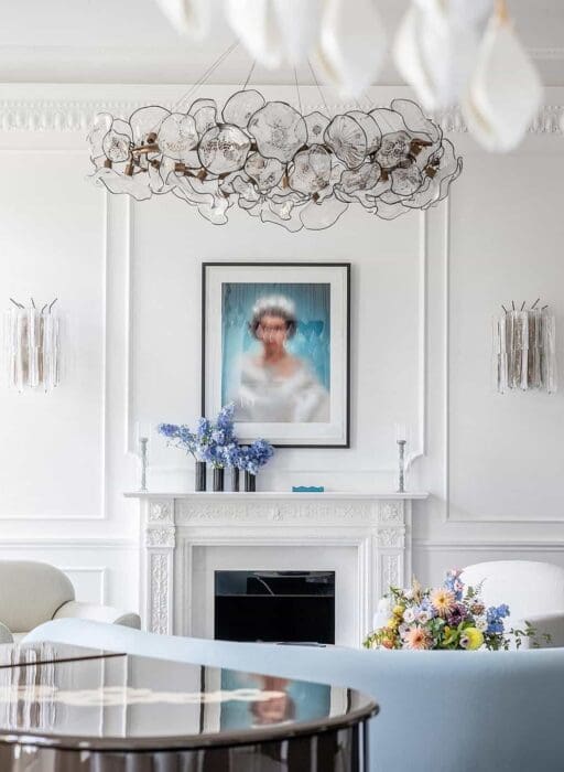 Over the dining table, for example, hangs a sculptural installation resembling raindrops, bulbs or cocoons. The line of a stream weaves through silk chairs and across tableware. On floor-to-ceiling shelves is displayed a backgammon board painted with butterflies in striking photorealism. The bathroom pays homage to Queen Charlotte’s menagerie, which housed one of the first zebras in the UK. The ‘Queen’s ass’, as it was known, is even embroidered on hand towels. The colour palette is natural and soothing throughout, with shades of grey and blue reminiscent of St James’s Park Lake mixed with warmer earthy tones and soft greens.