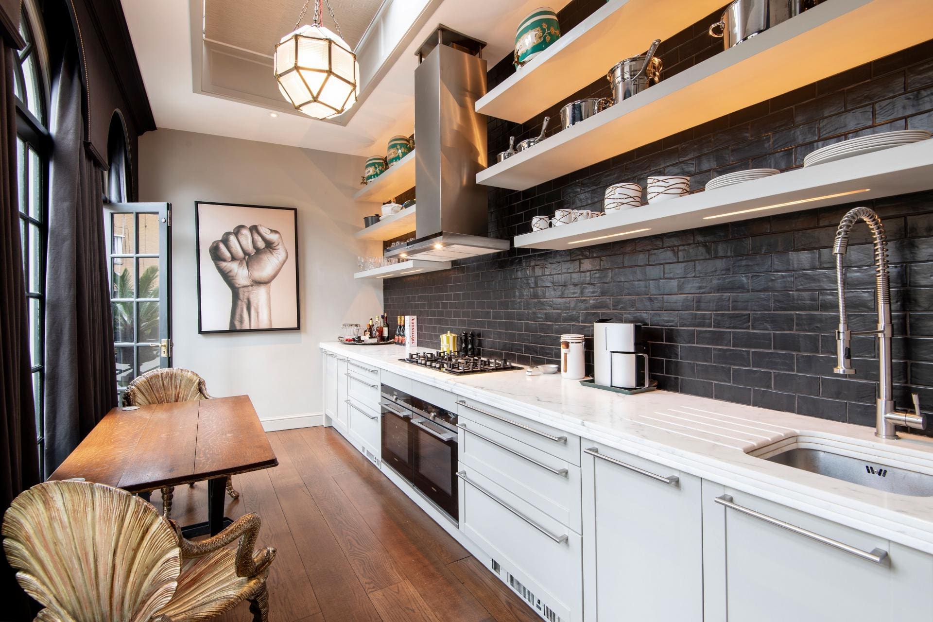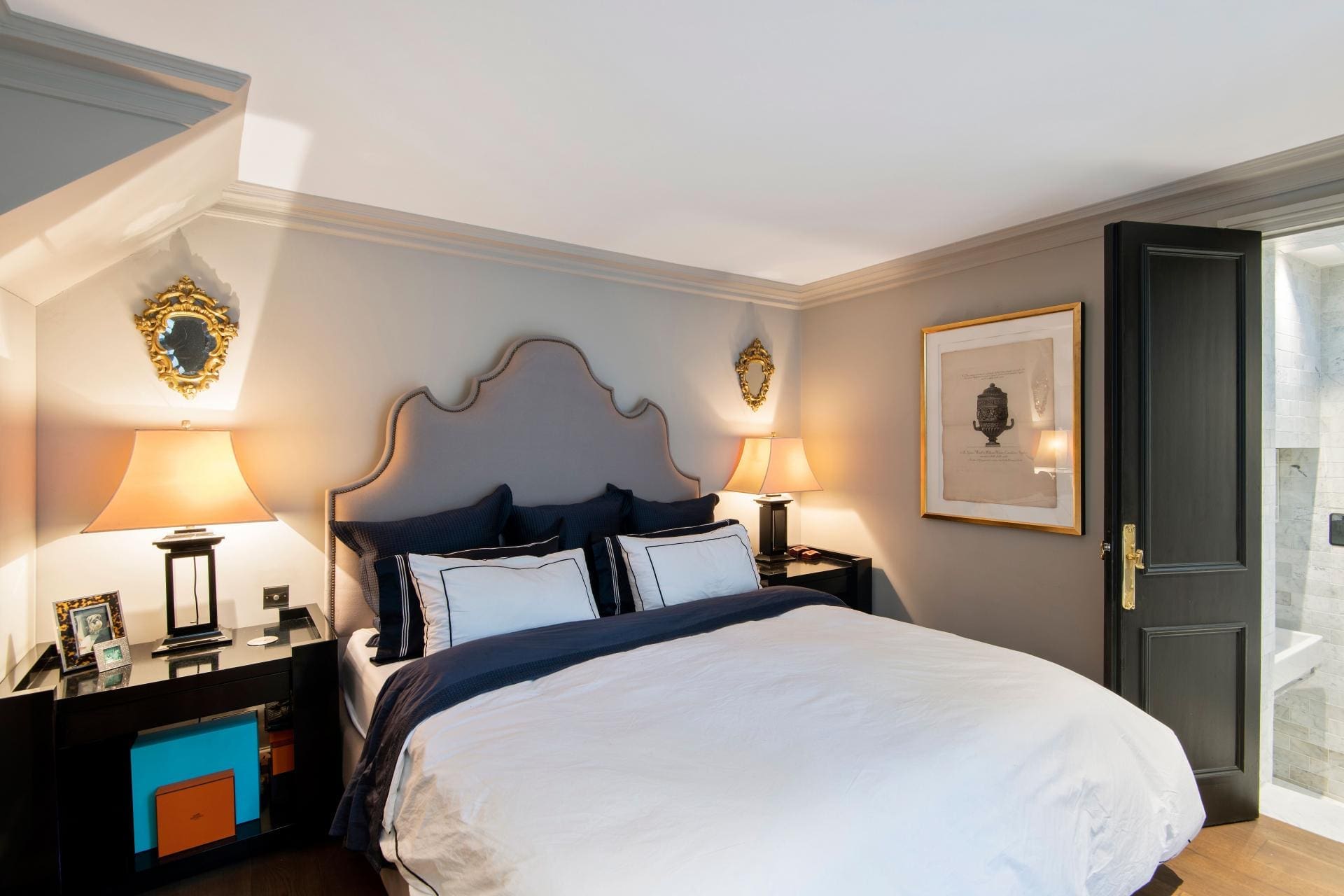 When you’re not soaking up the rays on the mosaic terrace, you can spend time upstairs in the large drawing room, which has high ceilings and overlooks the courtyard. The unusual metallic panelled walls complement the white marble stone of the 19th-century Louis XV-style fireplace and Regency fire basket. In the Bulthaup-designed kitchen, statuario marble countertops, a balcony and a generous dining area create an elegant space for entertaining.