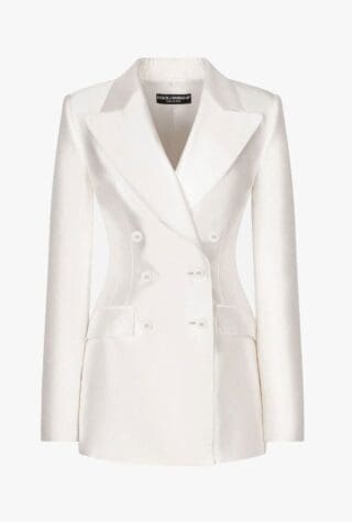 Rendered in a crisp white, this sleek jacket from Dolce & Gabbana is guaranteed to turn heads and makes for an ideal alternative to classic black or navy styles, without straying into jewel-tone territory. Cut for a streamlined double-breasted silhouette in fine mikado silk, it features peak lapels and shantung-covered buttons.