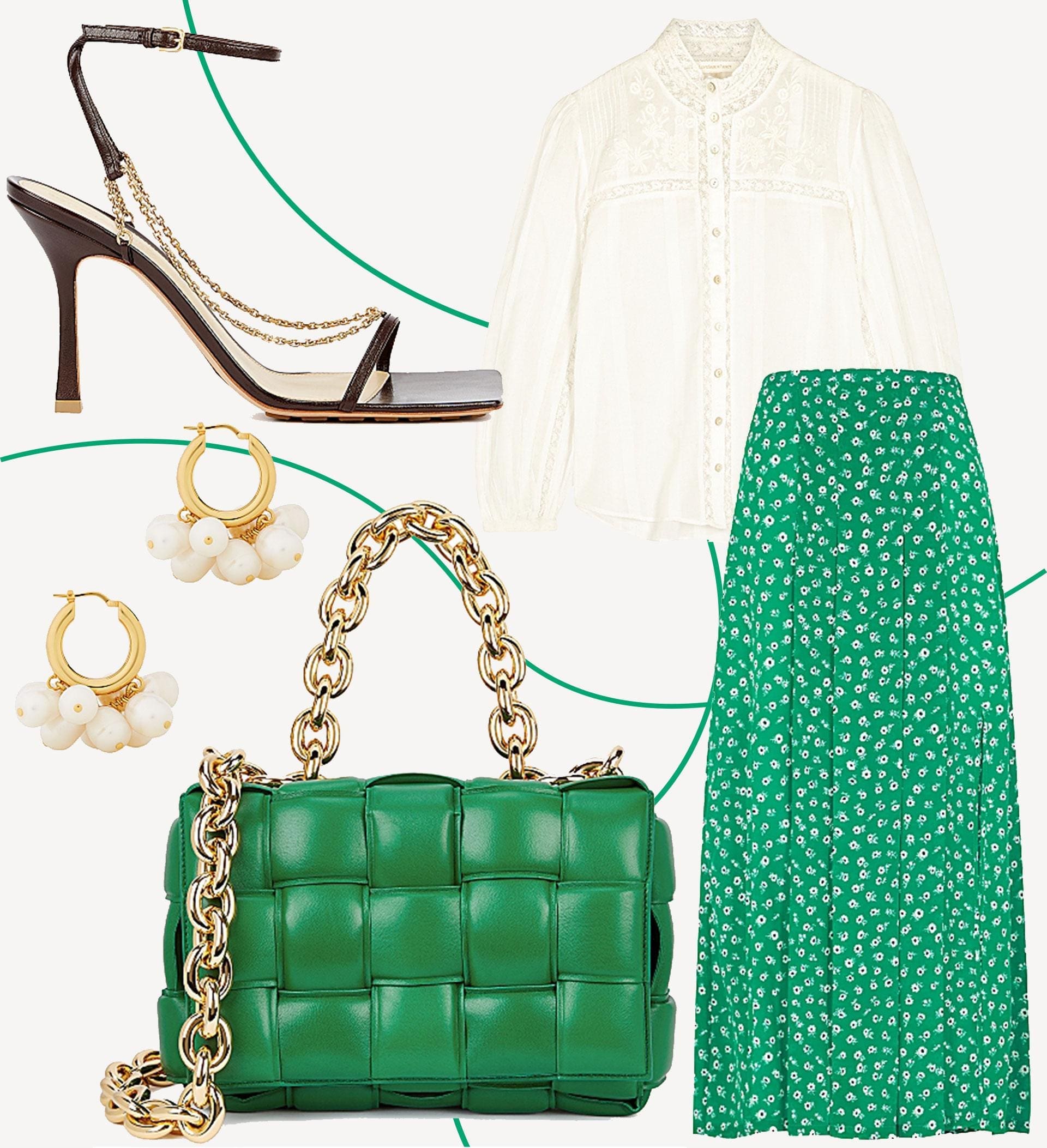 The colour of freshly mown grass and new leaves, there is perhaps no shade quite so synonymous with spring as green. The way to wear it now? In bold tones complemented by neutral accessories. Rixo’s ever-popular Georgia skirt has been recast in bright green and covered in bohemian white blooms – perfect for pairing with your favourite white shirt (we’re rather fond of this lacy design by LoveShackFancy). Bottega Veneta’s emerald woven bag partners well without being overly matchy while the brand’s Stretch sandals are the shoe to see and be seen in this season. Finish with Jil Sander’s oversized pearls for a look ideal for everything from work events to weddings.