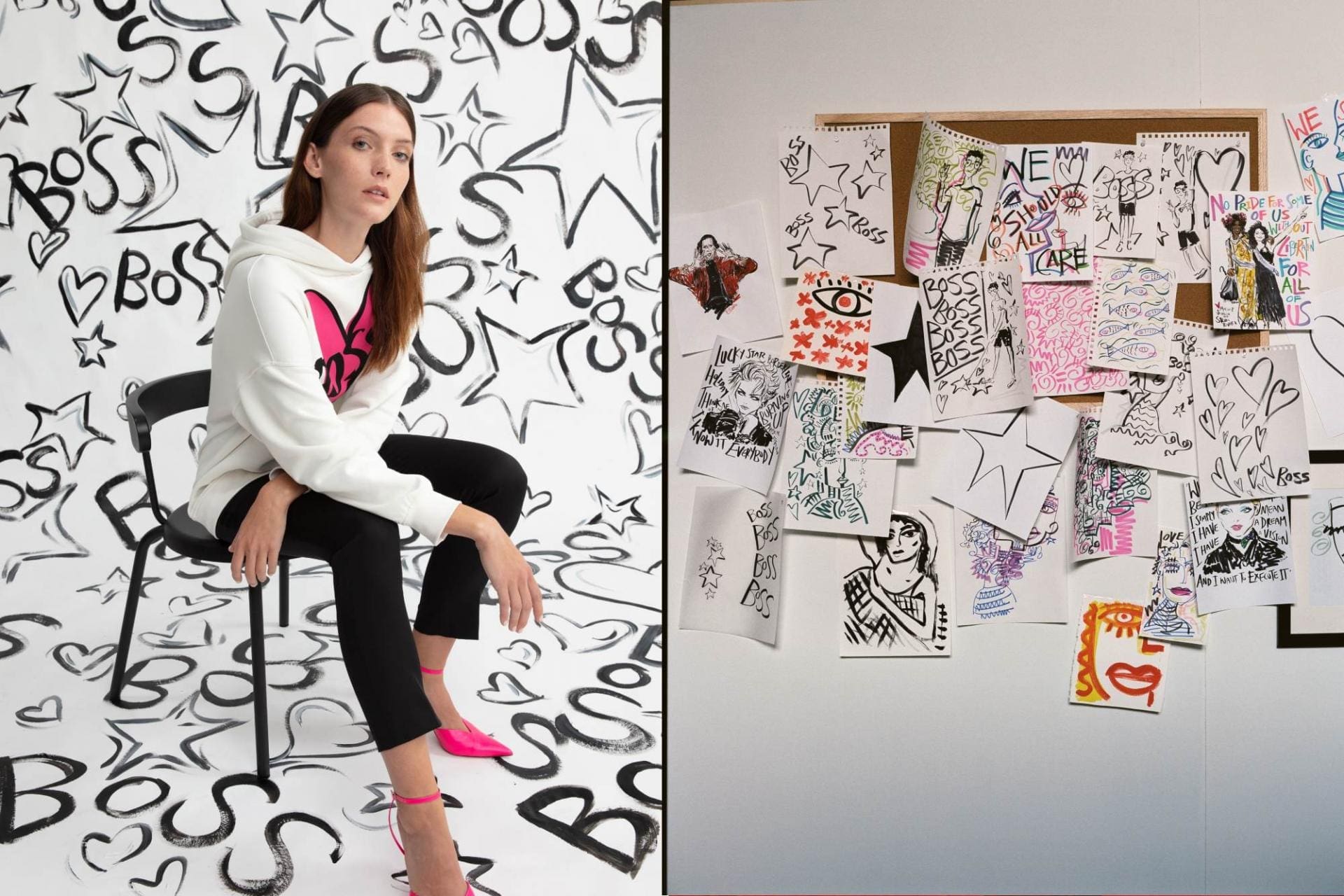 Fashion designer-turned-illustrator Justin Teodoro, meanwhile, has found himself returning to his roots, creating a capsule collection in collaboration with BOSS. The New York-based artist’s sketches of hearts, stars and a reinterpretation of the fashion house’s logo transform classic BOSS basics into whimsical works of art, with hot pink hearts and cobalt blue stars stamped onto T-shirts and pussy-bow blouses, embroidered onto knitwear and hidden within the lining of vibrant two-piece suits. Trainers feature printed soles and leather accessories are adorned with playful motifs.