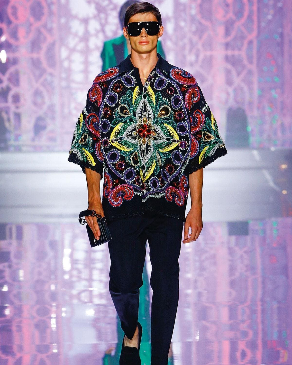 It will certainly be a joy to be decked out in the handmade, multi-coloured embroidery in the men’s collection, which features bright photographic prints on silk, and hip-hop influences embellished on denim. It is, you might argue, a far cry from the signature elements (slim-line silhouettes, hourglass dresses) on which the Dolce & Gabbana empire was built.