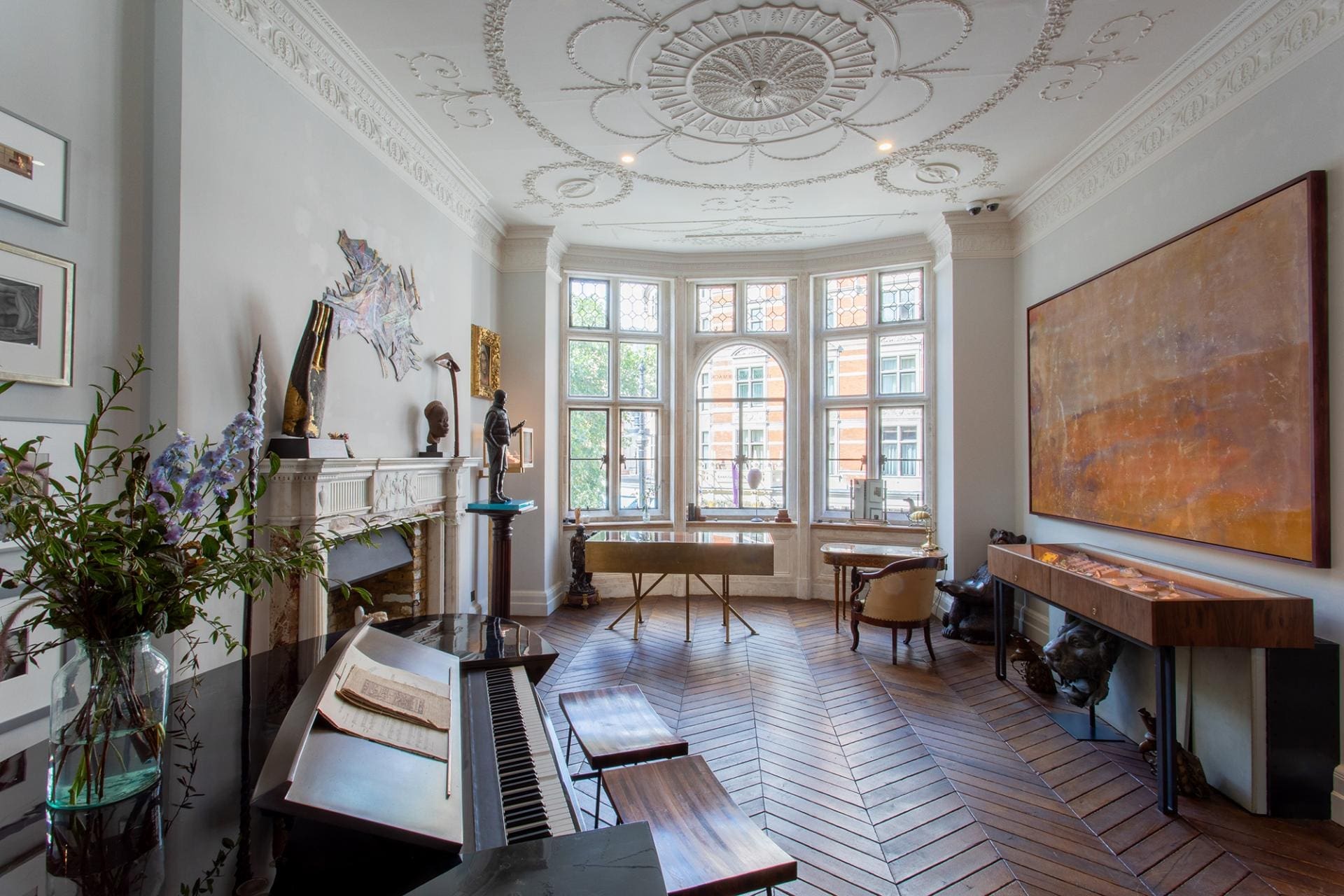 Paintings by Frank Bowling and Basil Beattie currently adorn the walls, while a cloud of pampas grass hangs from the ceiling and anemones are arranged in antique marmalade jars. Upstairs, a self-playing piano tinkles by a large bay window. “Everyone says that retail is dead but it definitely is not,” she asserts. “You just need to work a little harder to entice customers.”