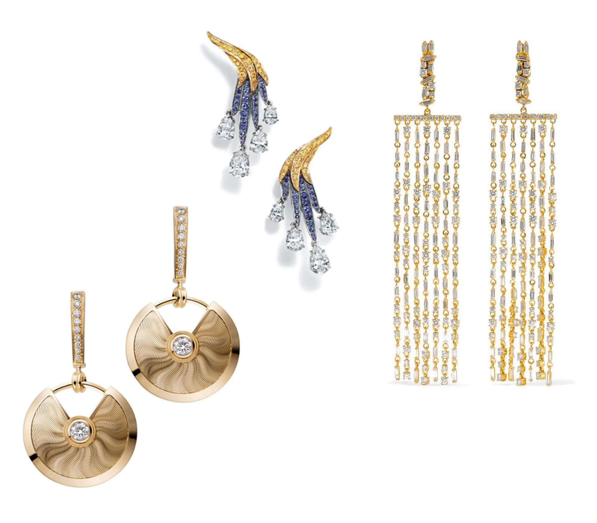 Earrings are big this season, figuratively and literally, dropping and dangling from every nook and rook. Amrapali offers seductive, ’70s-inspired swirls while diamonds go disco at Diane Kordas, dotted on hoops and geometric designs. Continue the ear party with Suzanne Kalan’s elegant drop designs, strung with shimmering chains.