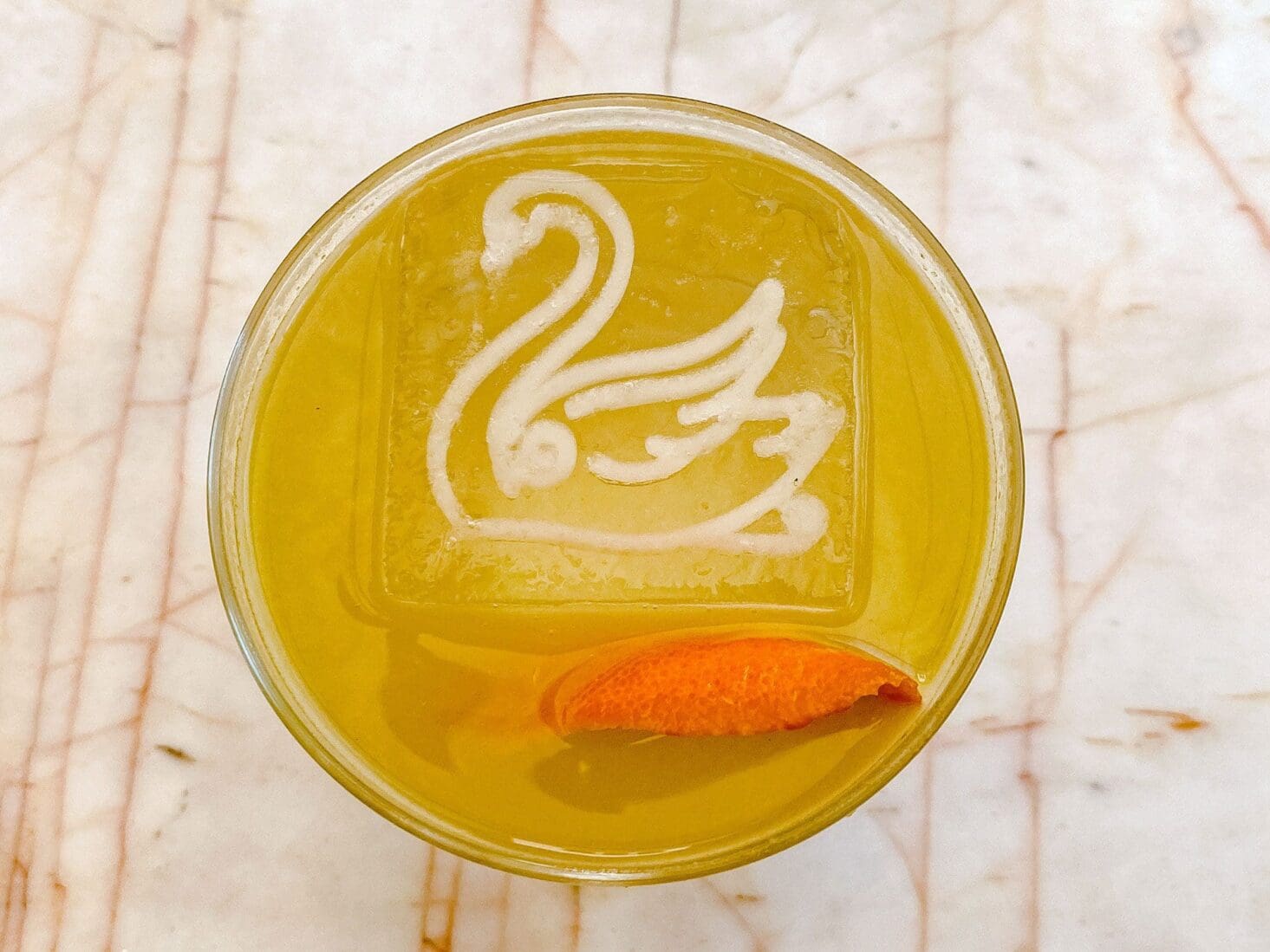 2oz rum2 dashes bitters½oz simple syrup2oz fresh pressed Granny Smith apple juiceSwan ice cubeOrange twist garnish