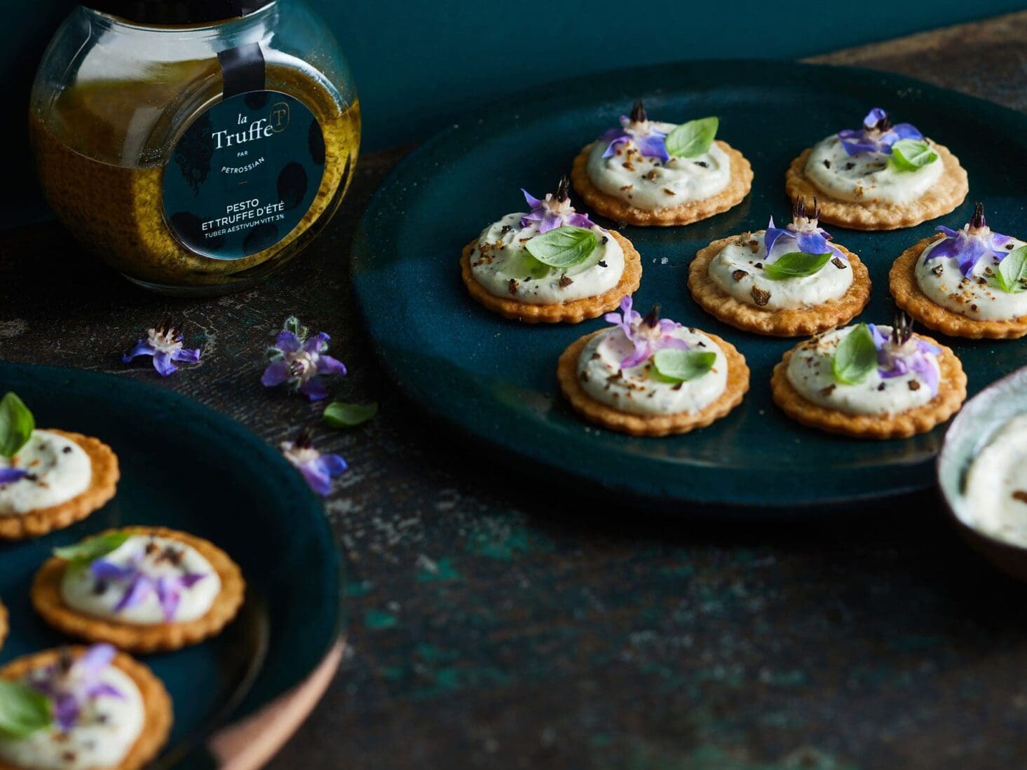 For the topping1 pot of Petrossian Pesto & Summer Truffle Sauce200g Philadelphia-type cream cheeseSalt and pepper For the shortbread100g grated Parmigiano Reggiano130g flour1 egg yolk100g room-temperature unsalted butter2 pinches of table salt2g cracked black pepper