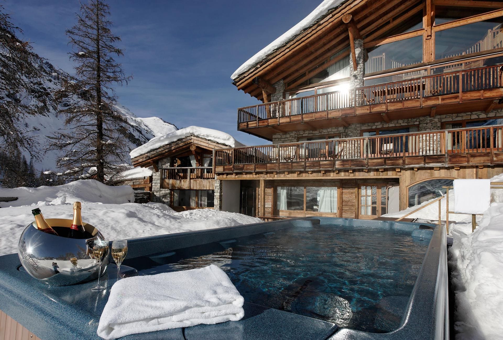 A luxurious ski chalet discreetly hidden in the mountains of Val d’Isere, with 10 en-suite bedrooms; an 18ft outdoor swim spa and two outdoor hot tubs, flanked by snowy peaks.