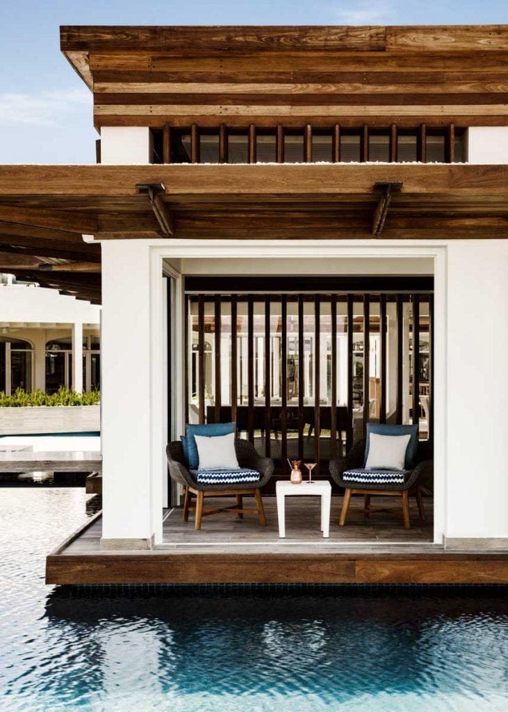 Rooms walk the line between trend-led and traditional. Local linens, bleached wood beds and elegant naval shades combine with sliding doors, bold geometric tiles and oversized, freestanding baths. Patios with armchairs offer the perfect place to relax in the unlikely event that it all gets too much.