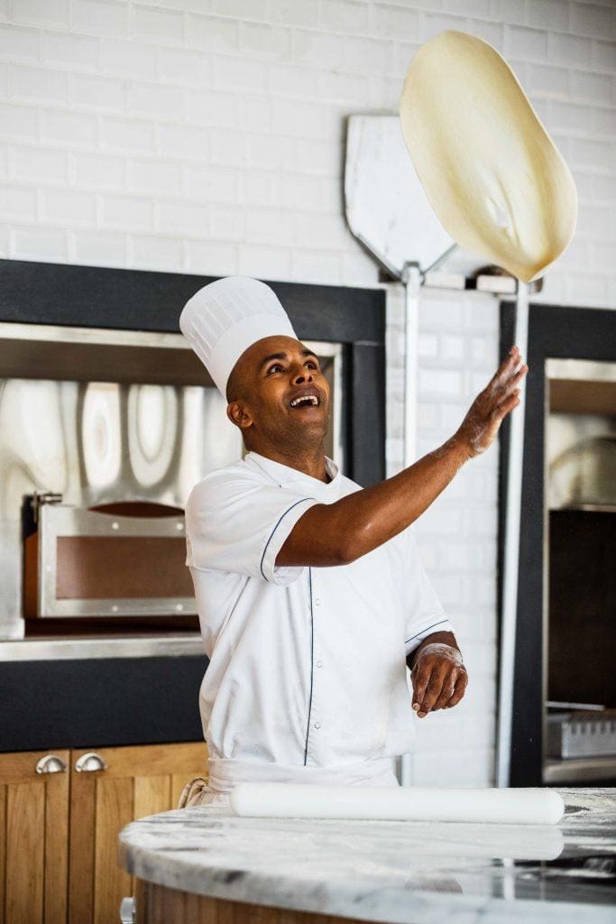 Throughout the resort, quirky touches compete to offer the perfect Instagram shot. Inflatable pink flamingos pop out of the lagoon. Hammocks sway gently between palm trees. A scarlet phone box invites guests to ‘phone home’. An ice-cream truck – proffering homemade gelatos and a bright beachside mural by French artist Camille Walala – provides a graphic backdrop to the beach bar. Cheerful, handwritten signs abound.