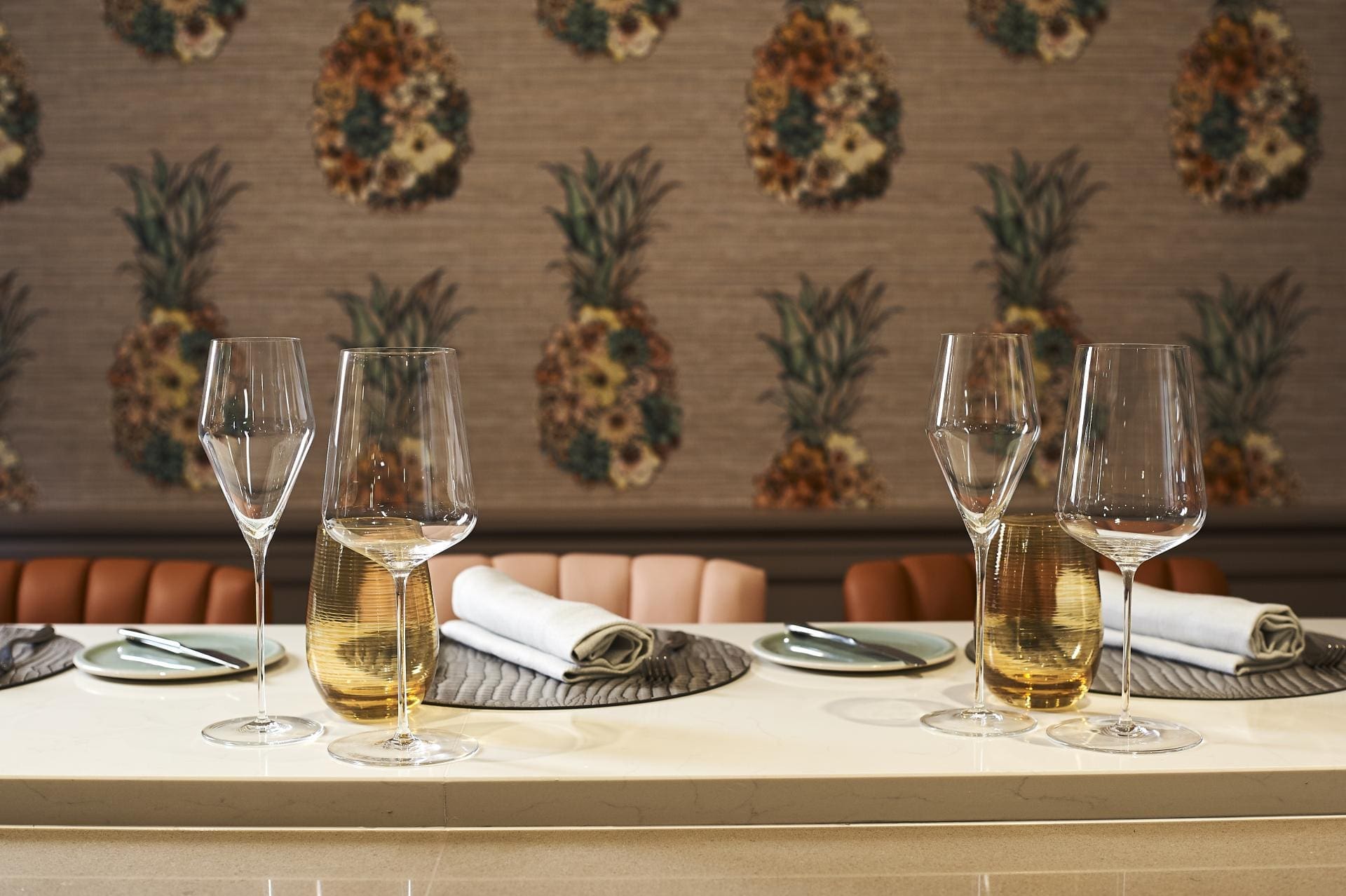 It’s an intimate room, with pineapple-print wallpaper and a curved table around the cooking and prep stations that seats 12. Head chef Sam Bowser, who has earned his stripes at places such as The Square, Le Manoir aux Quat’Saisons and The Arts Club, is so at ease with guests being close enough to reach out and touch what he’s preparing that the resulting atmosphere is as relaxed as it is fun. I ask Sam about the restaurant’s name, now that I know how to say it, and he explains that they already have the Back Garden restaurant – more formal than the gastropub Potting Shed – so MO came from mow the lawn. Yes, really. “Chefs can’t spell!” he jokes, and he’s already won us over.