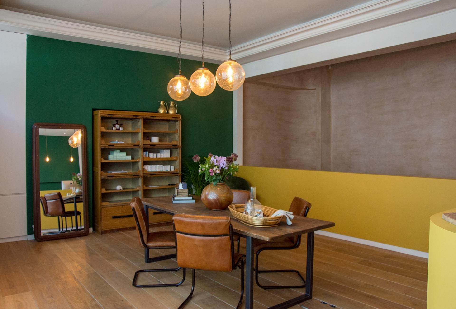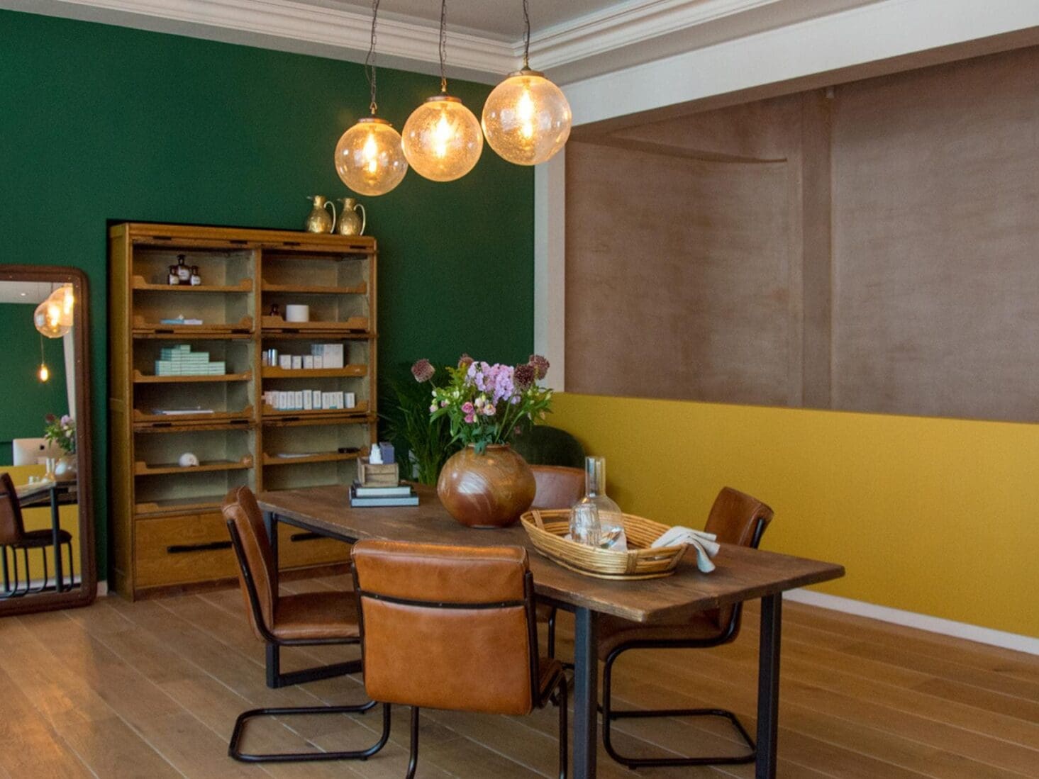 Evans has now moved into a clinic to call one’s own, on pretty Portland Road in Holland Park. The new Skin Matters studio is certainly not your standard medi-clinic. The chic enclave sets bare plaster walls against dark green and muted yellow hues, complemented by velvet sofas and a large communal table, where visitors are encouraged to unwind. The space has aspirations far beyond a beauty clinic, and Evans hopes to soon host workshops and events, while fostering a like-minded community.